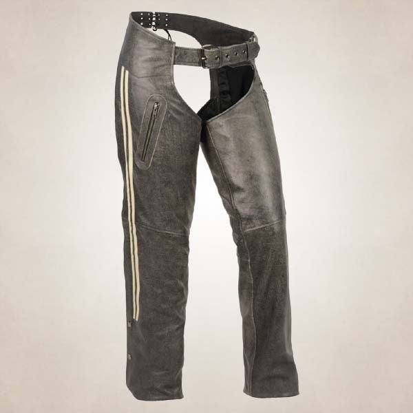 Women’s Vintage Slate Grey Leather Chaps with Racing Stripes
